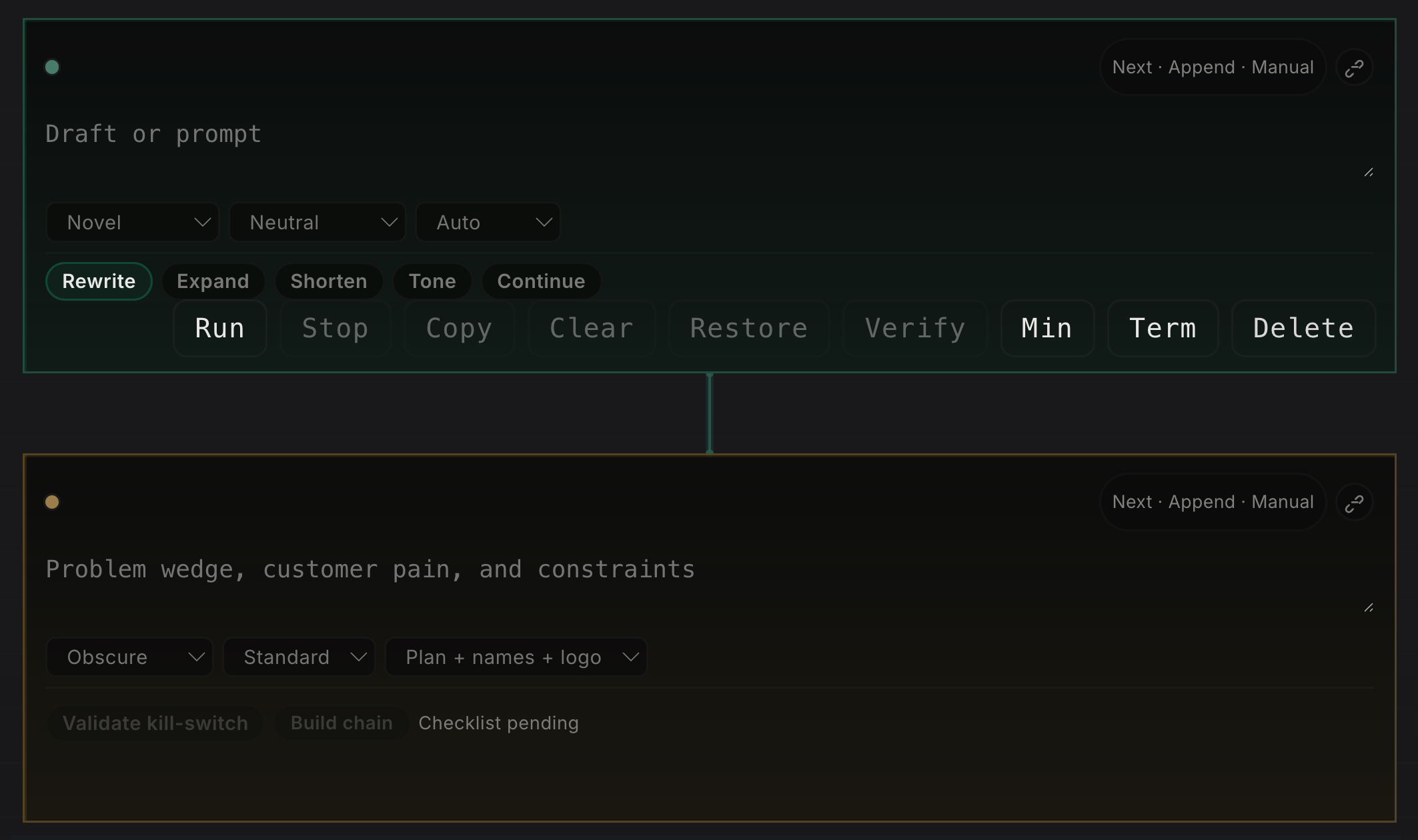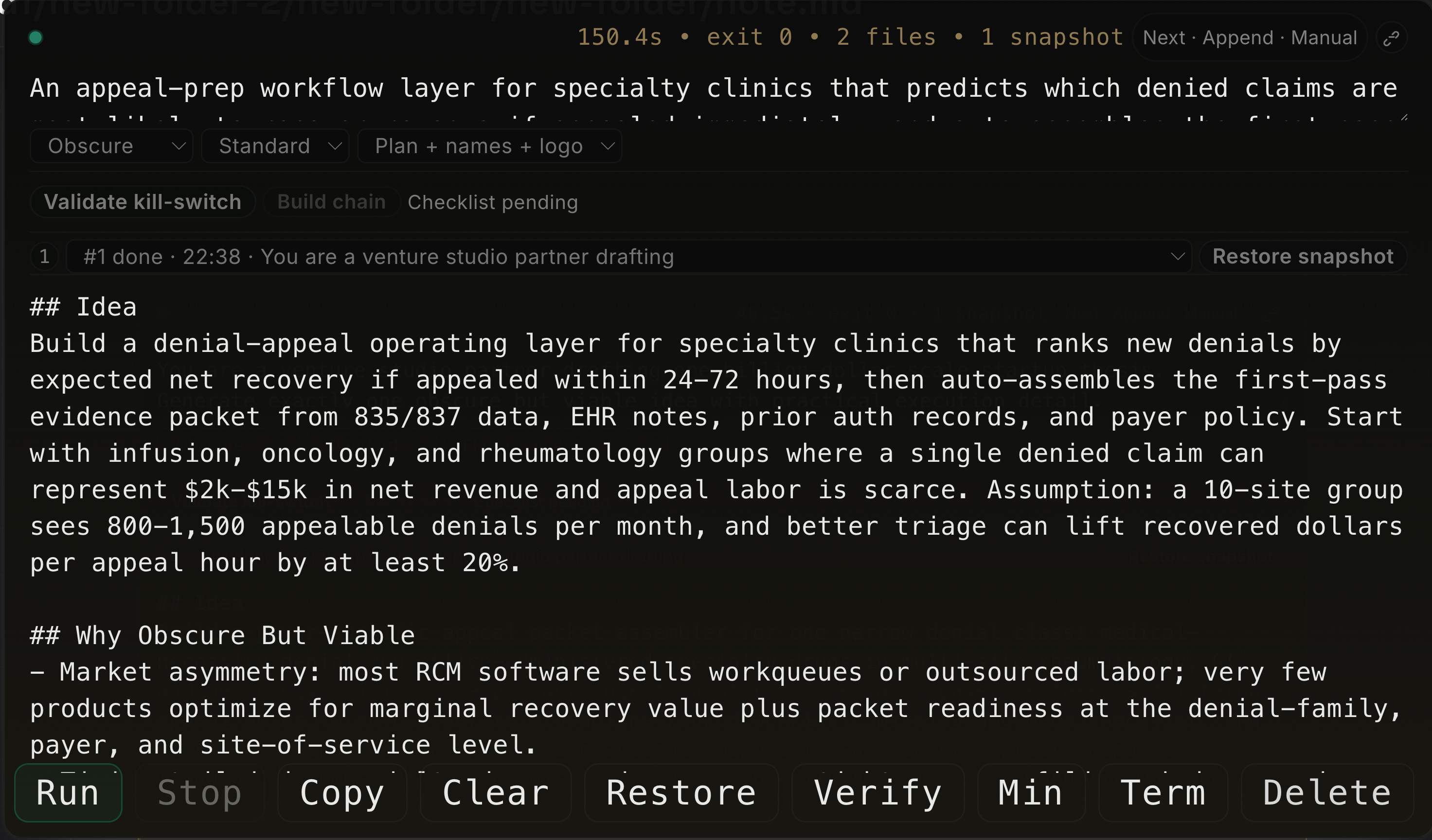 The idea cell is for generating a startup or product thesis from a specific context. It is not just a brainstorming box. It expects a market or workflow prompt and produces a constrained output: the idea, why it might work, customer pain, business model, moat, a 90-day plan, risks, kill criteria, and a validation checklist. In other words, it forces the model to move past slogans and into testable claims. It is useful when the goal is not “be creative,” but “produce a thesis that can survive contact with reality.”