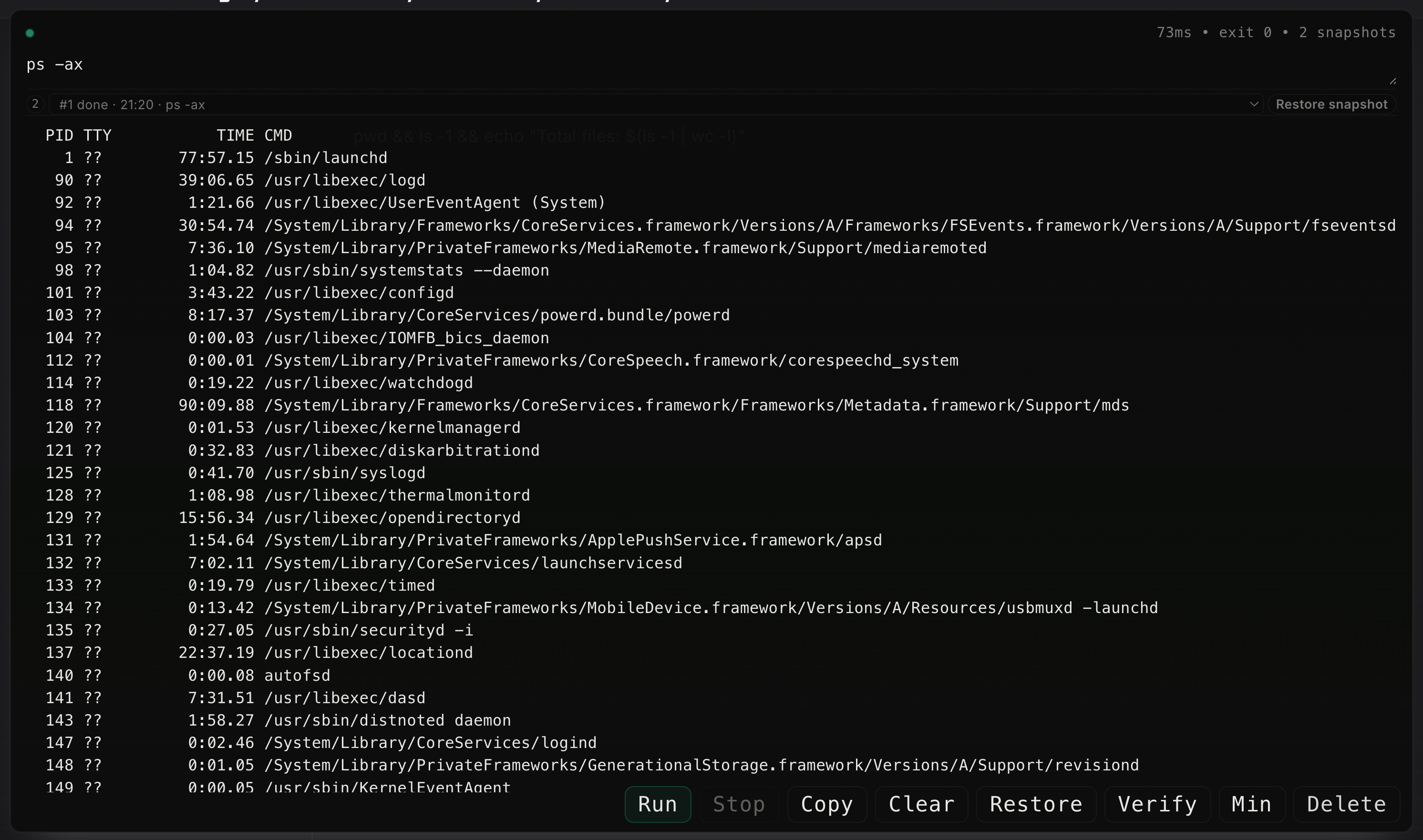 The simplest one is the terminal cell. It runs commands and stores the command, stdout, and any generated artifacts with the note. This matters because command-line work is usually transient. You run something, read the output, then move on. A terminal cell keeps that step in place. It can be rerun, inspected later, and linked to other cells. In practice, it is the lowest-level cell because it touches the actual system rather than generating prose about it.